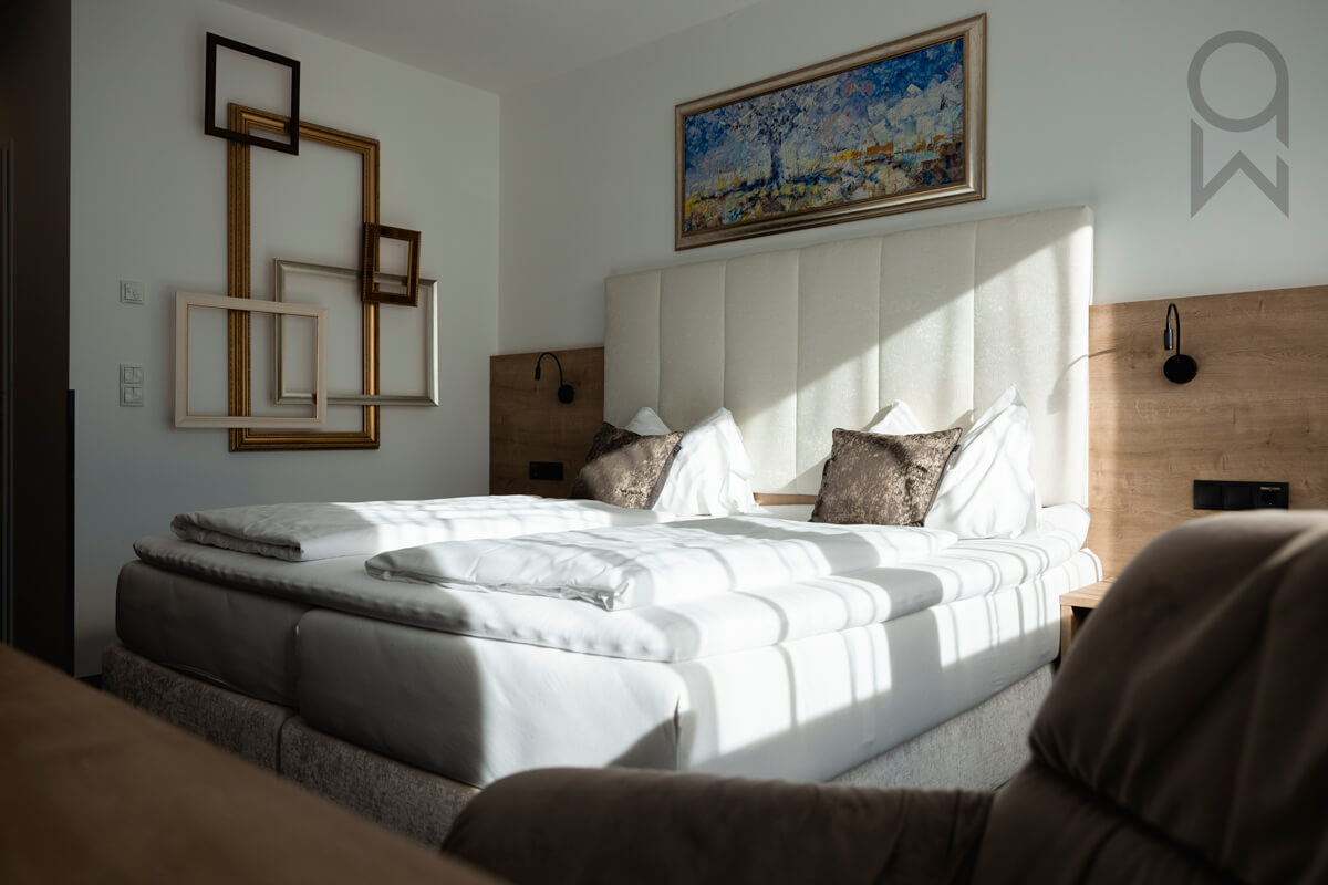Hier beginnt Erholung ganz selbstverständlich. Großzügige Zimmer mit Bergblick, klare Linien und eine angenehme Zurückhaltung im Design schaffen Raum für Ruhe. Ob nach einem aktiven Tag in den Bergen oder einem Termin in der Stadt – im Hotel Goldene Gams finden Sie einen Rückzugsort, der bleibt.